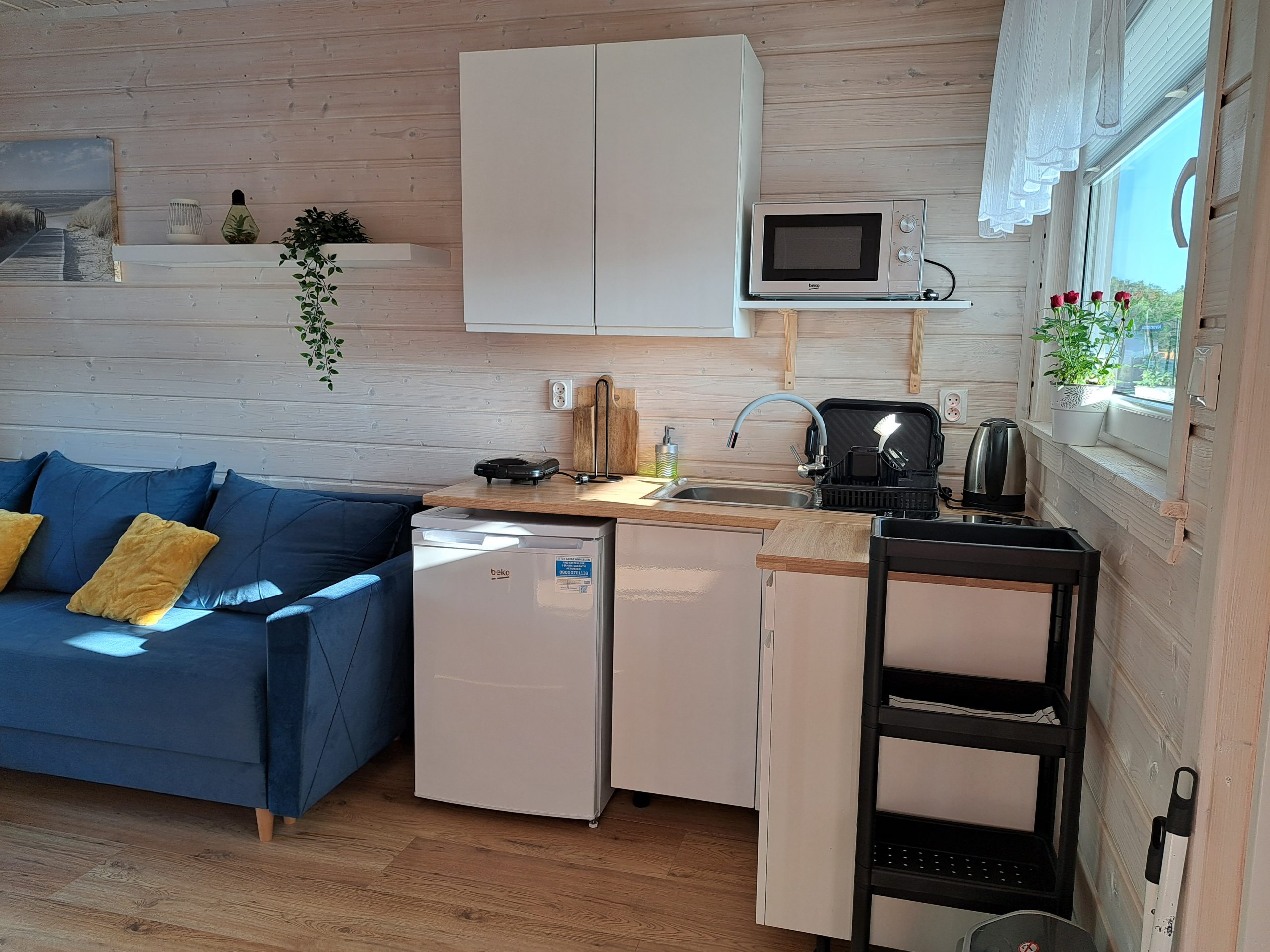 – aneks kuchenny wyposażony w niezbędną zastawę stołową, garnki, miseczki itp., lodówkę, mikrofalówkę